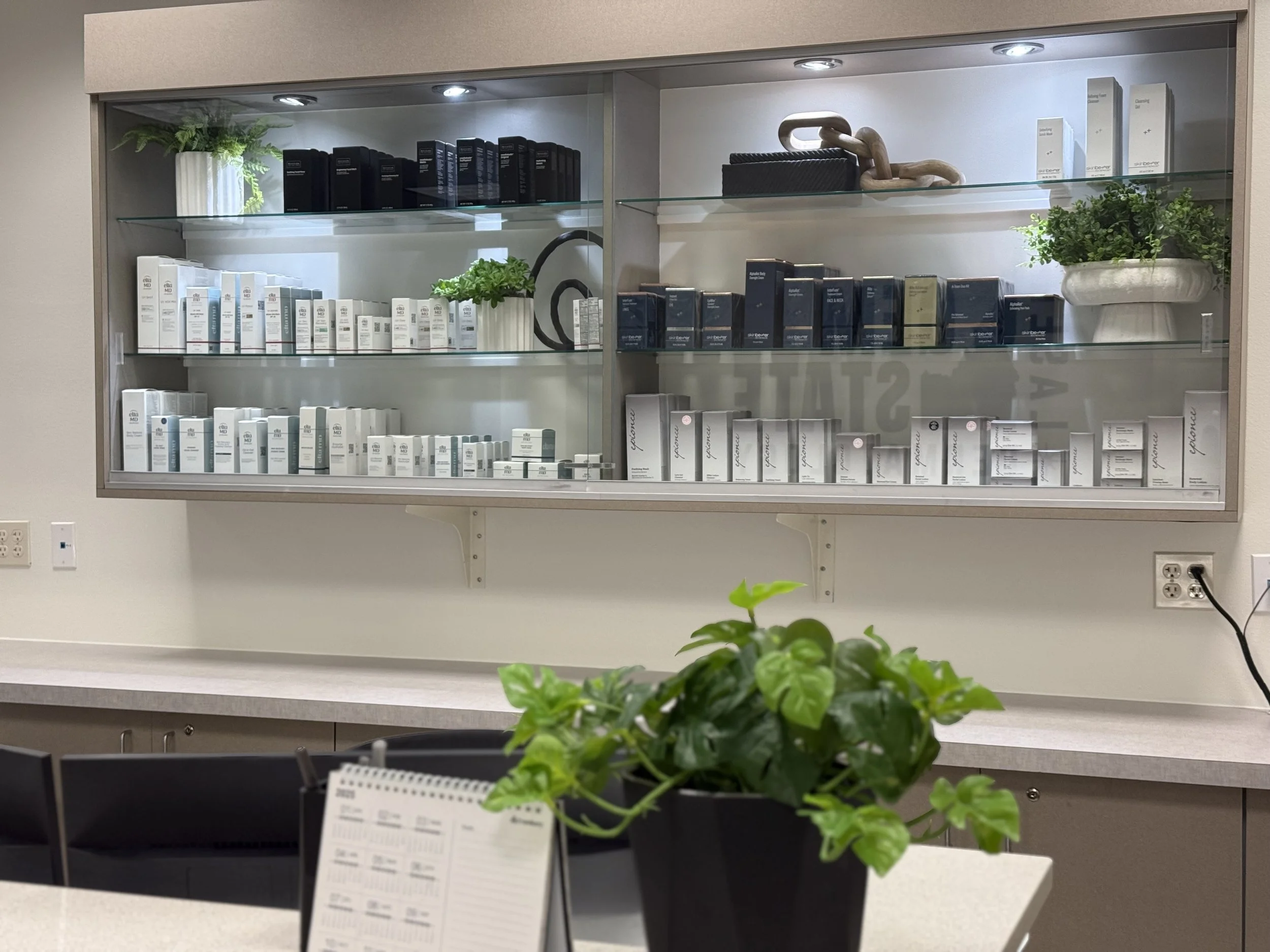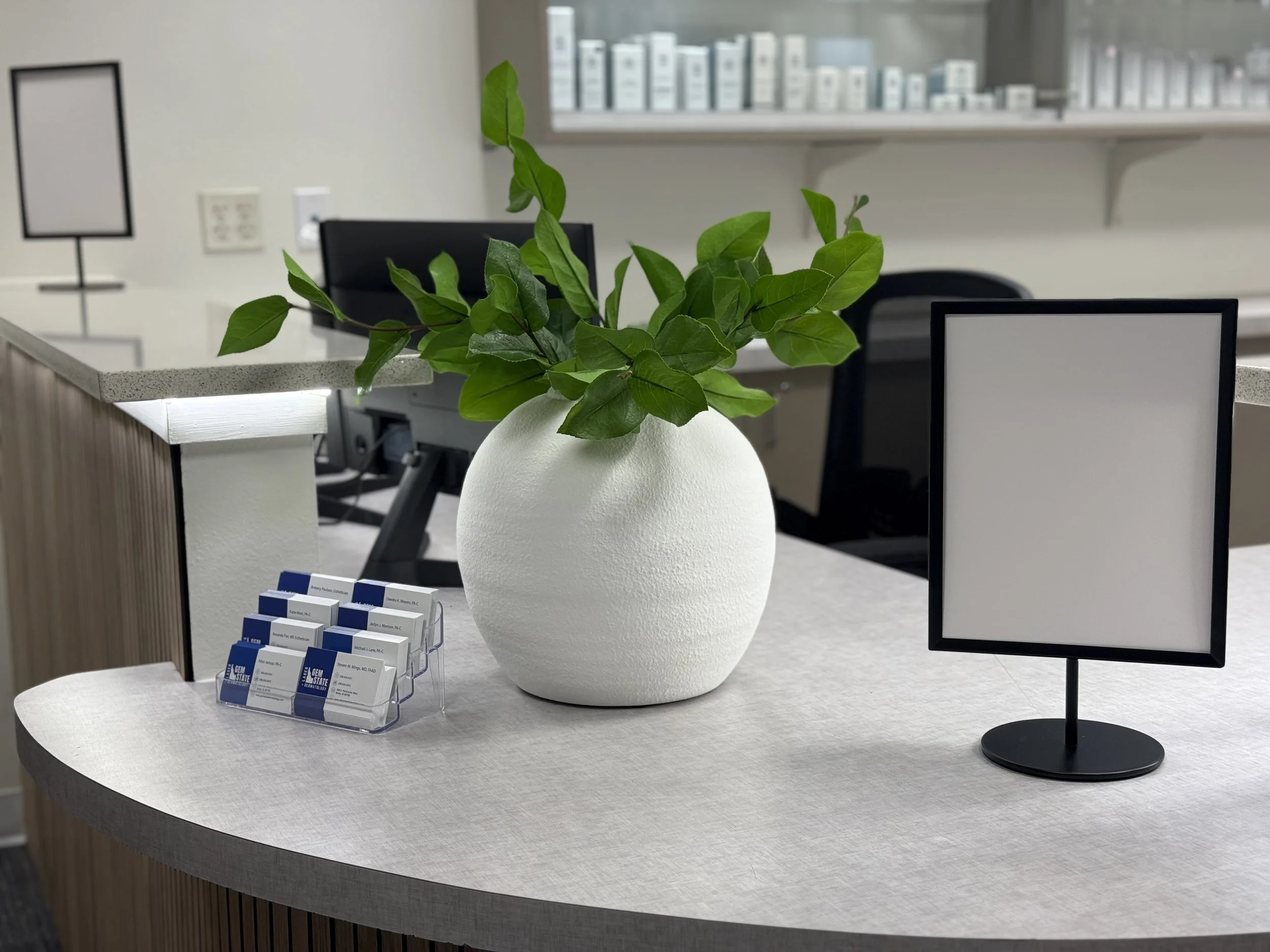Warm wood accents were added throughout the space, including the reception desk and checkout area, bringing in natural texture and softening the overall aesthetic. Accessories were thoughtfully reimagined, and new artwork was added to elevate the interiors and bring a sense of calm and visual interest to patients and staff alike.