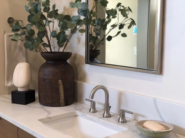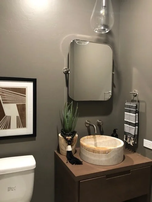 A powder bath includes a floating vanity with a stone vessel sink and a wall-mounted faucet, adding refined texture and understated elegance.