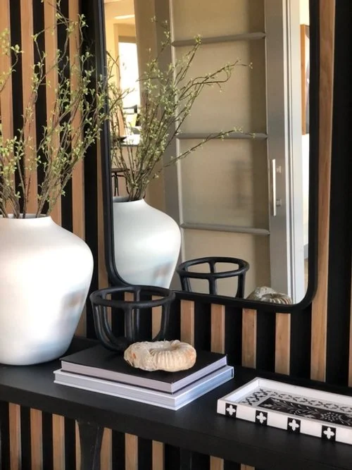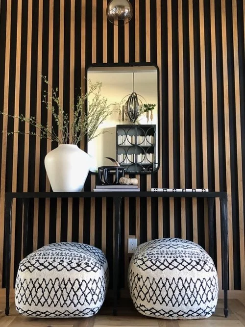The entryway features a striking slatted white oak wall with a black backdrop that echoes the nearby fireplace. White oak floating cabinets flank the fireplace, maintaining clean lines and cohesion.