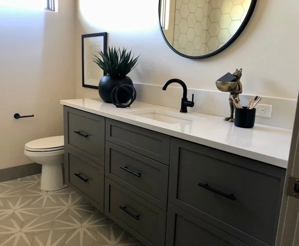 The hall bath features playful yet sophisticated gray and white star-patterned hex tile, with matching gray cabinetry. The geometric theme continues in the shower for a cohesive look.