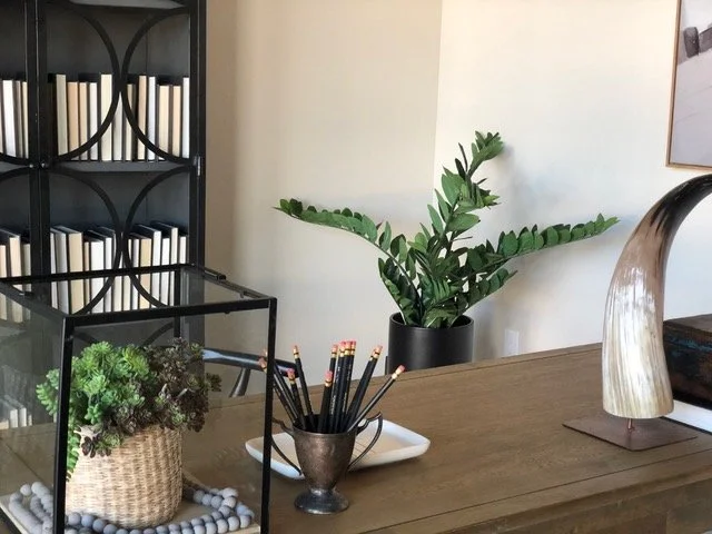 The home office takes advantage of a wall of windows for natural light, while a large statement chandelier adds architectural interest.