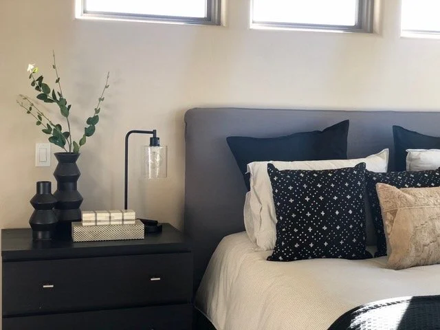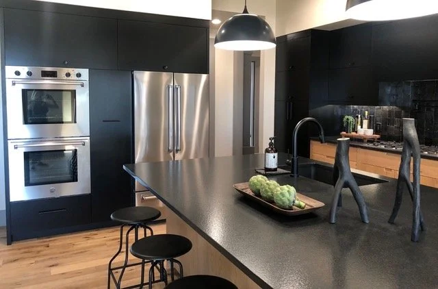 This Modern Masculine design brings a bold, structured aesthetic to this refined new built home created for a single man. Throughout the entry, living area, and kitchen, the pairing of black and white oak cabinetry with wood accent walls creates a moody, tailored atmosphere.